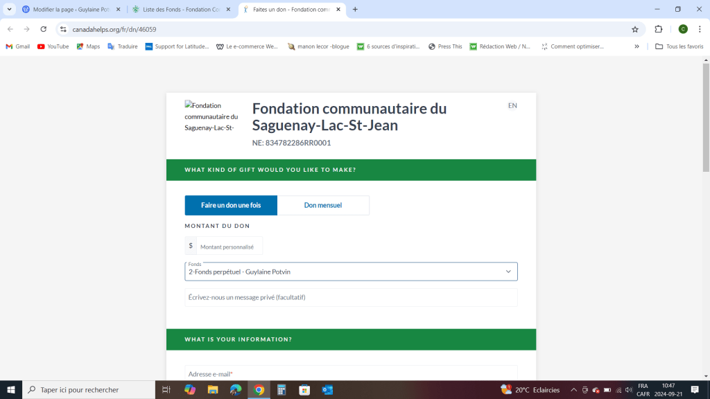 Rendez-vous sur le site de la Fondation communautaire du Saguenay – Lac-Saint-Jean, sélectionner le Fonds perpétuel Guylaine Potvin et suivre les instructions.